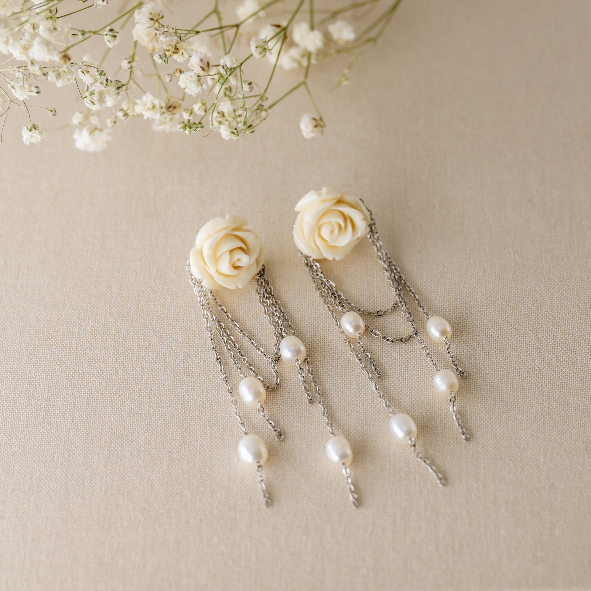 • These elegant earrings feature stunning rose in resin and natural freshwater pearls