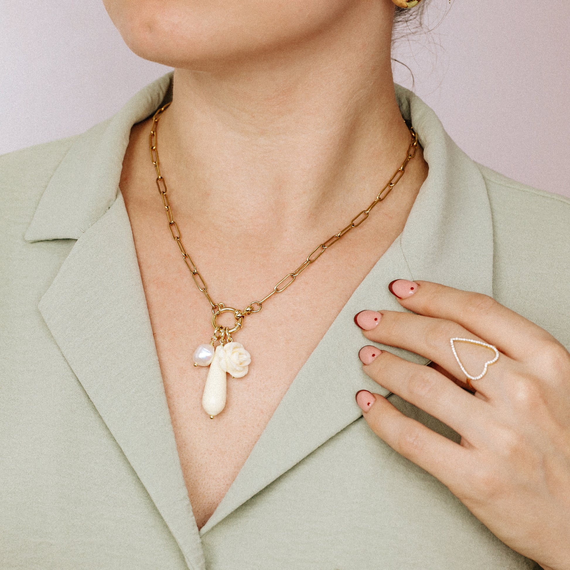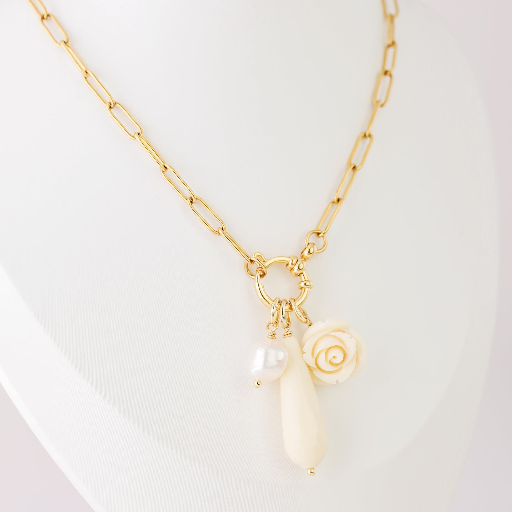 Add a touch of elegance to your outfit with our Pearl and Rose Charm Necklace. The cream-colored charms, adorned with delicate flowers and pearls, are made from high-quality stainless steel by BYSDMJEWELS. Elevate your style and make a statement with this timeless piece.