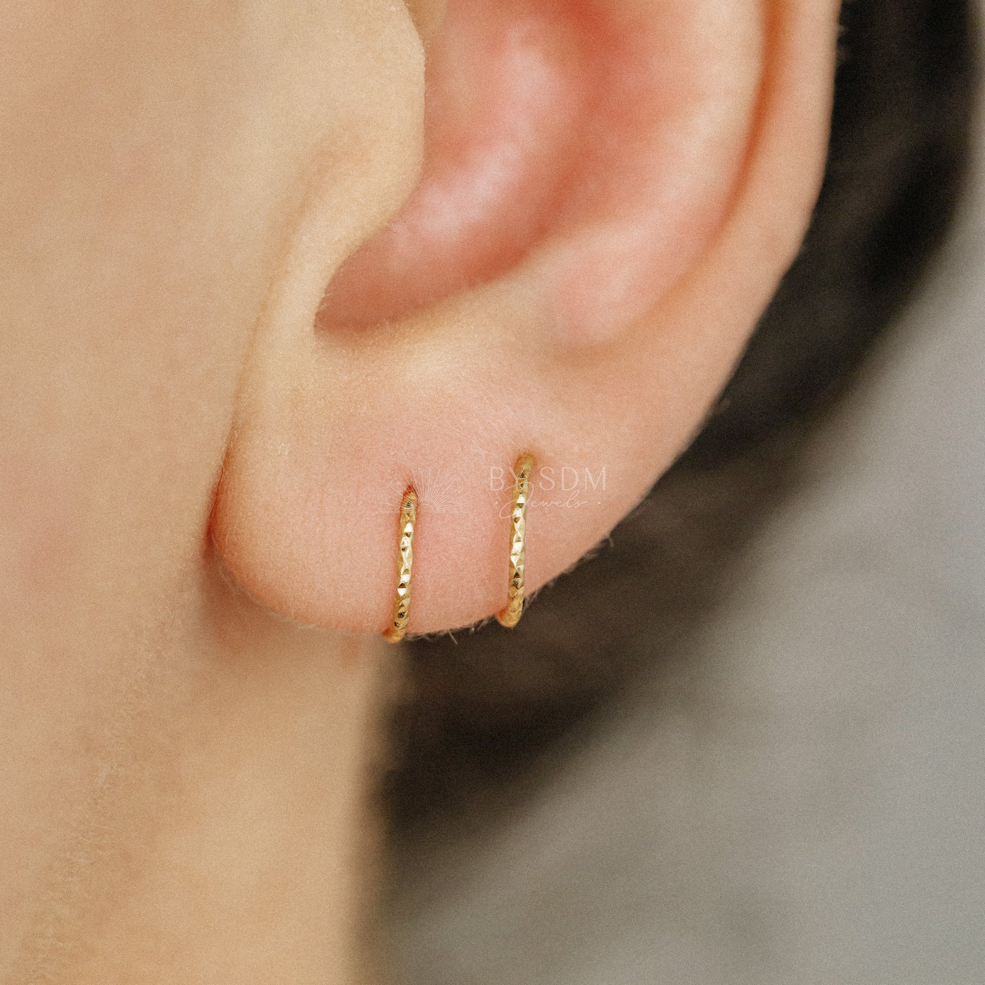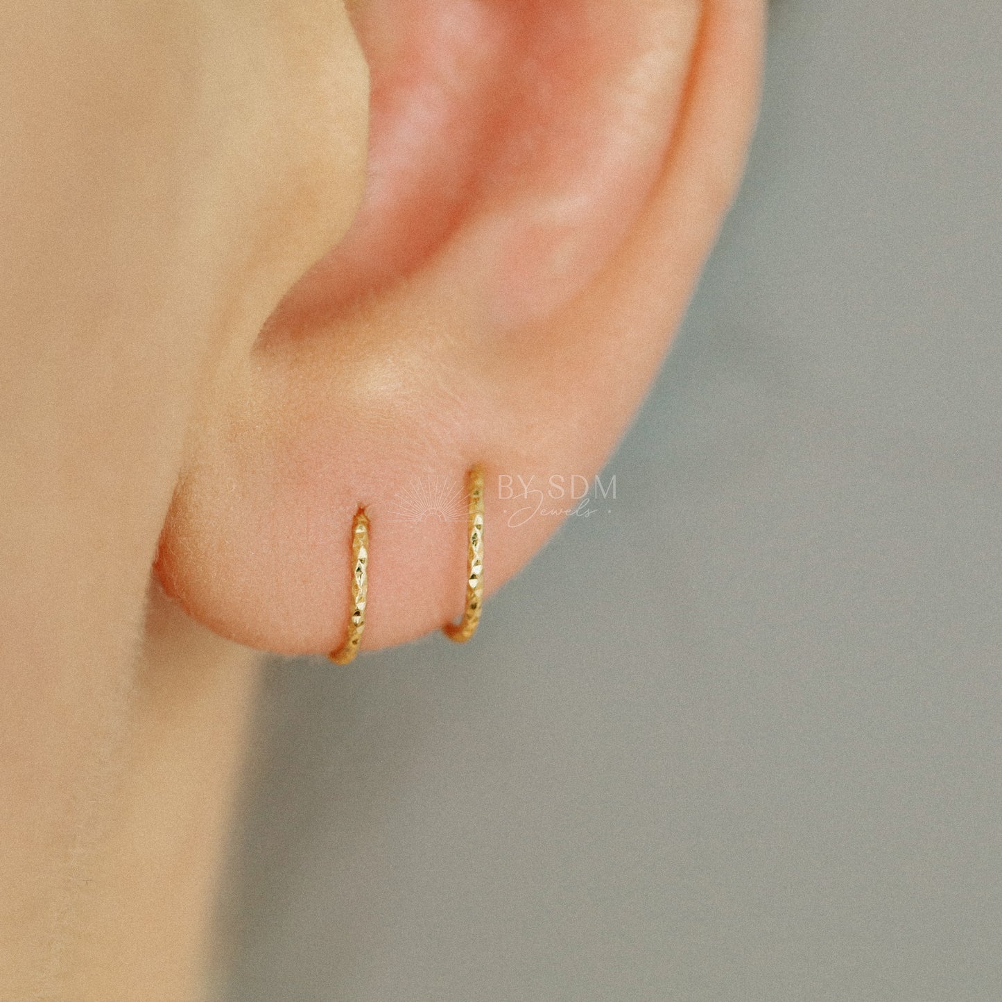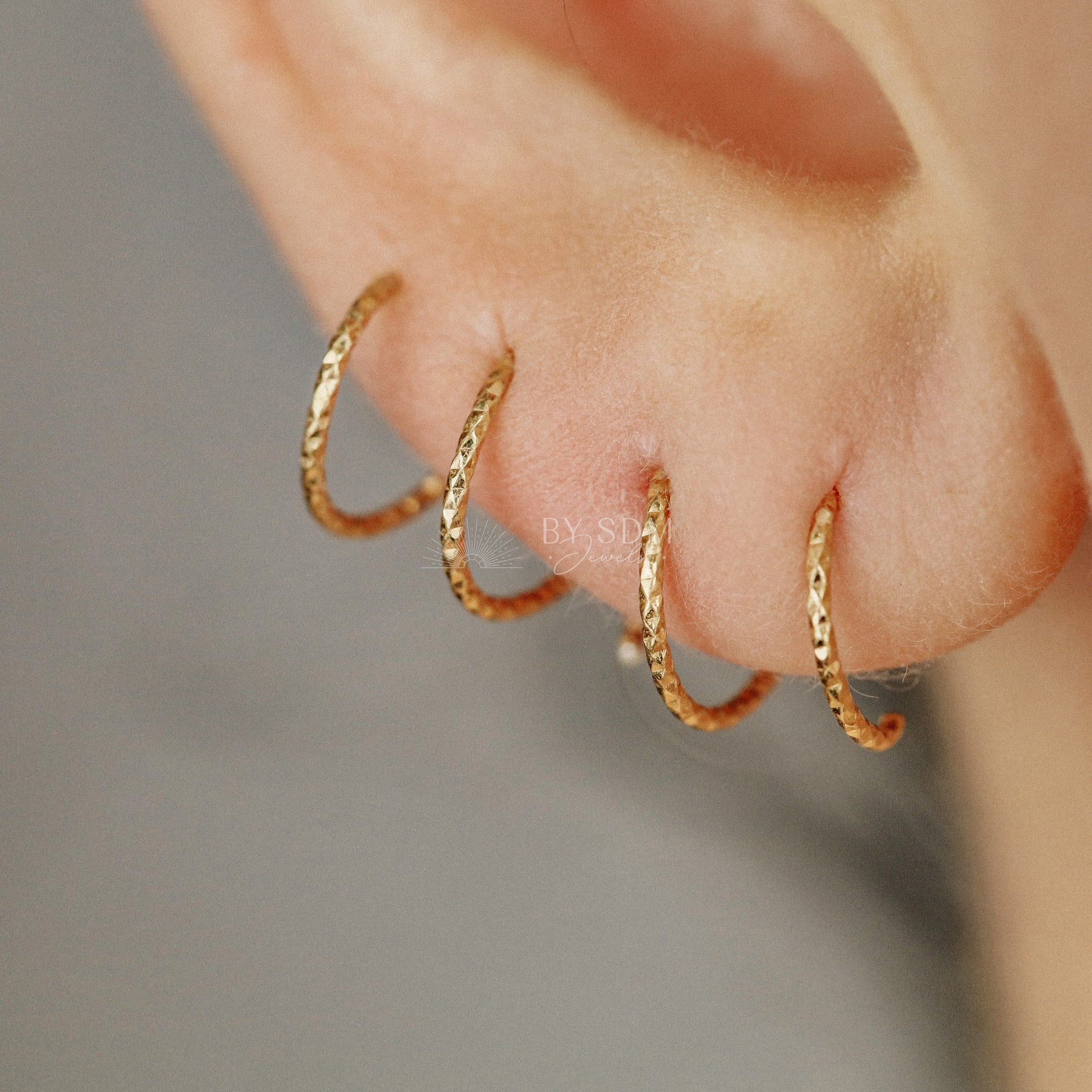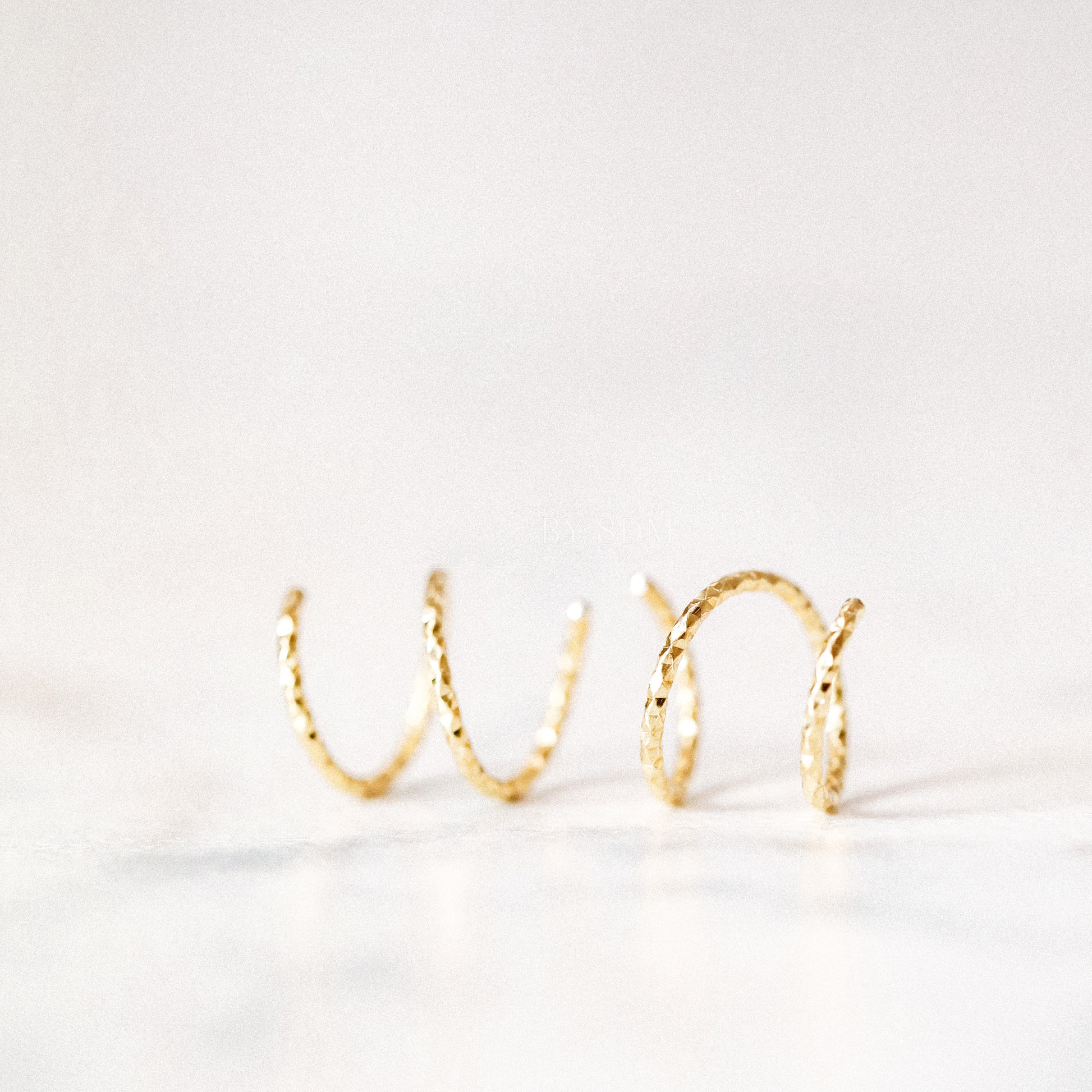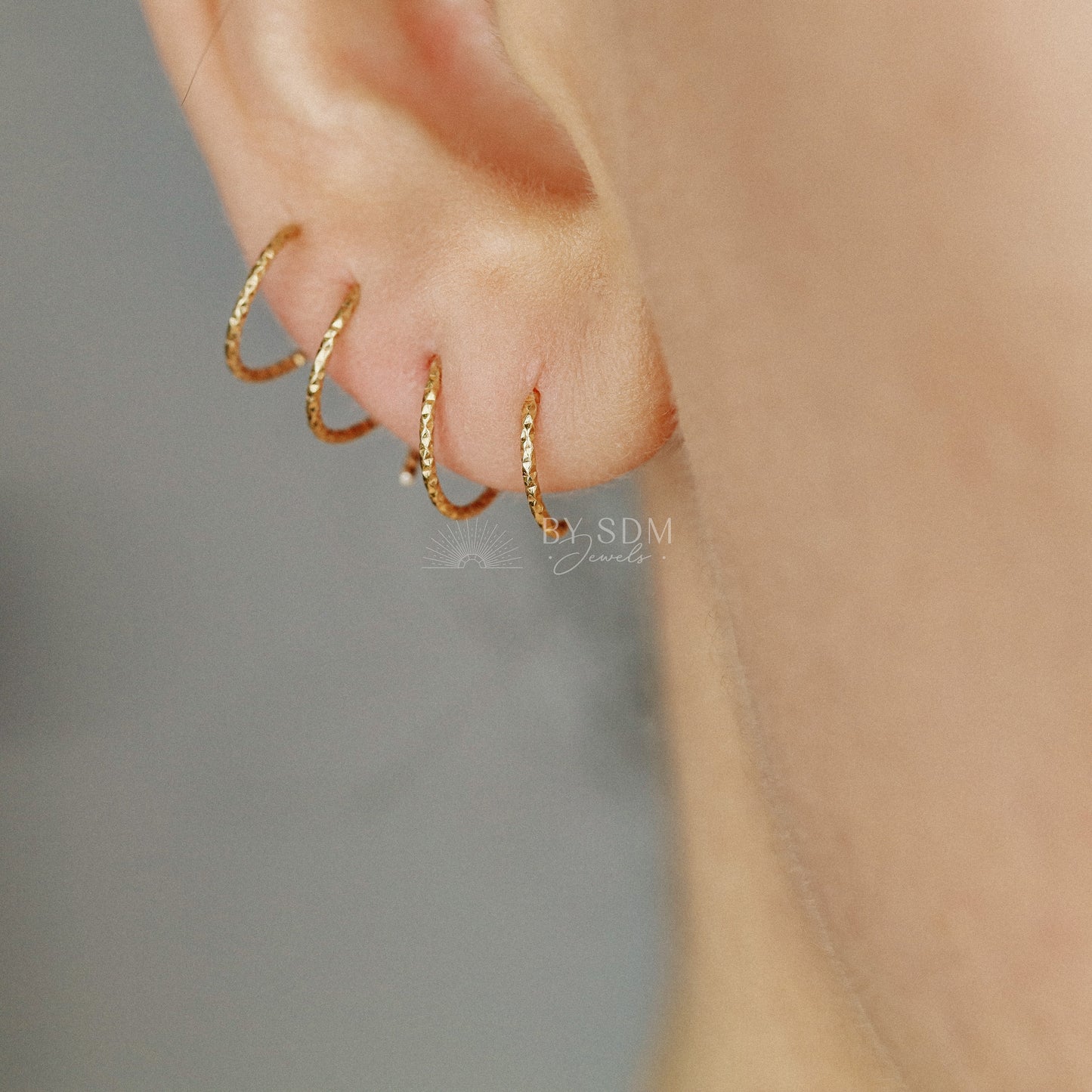 All you do is thread one side through your first hoop until the other side sits comfortably on your earlobe giving the illusion of a second hole. These are slightly adjustable as you will need to bend and mold the wires a bit to fit comfortable to your earlobe. Since everyones ear is different, they might look slightly different than photo depending on how high or low your piercing is.
