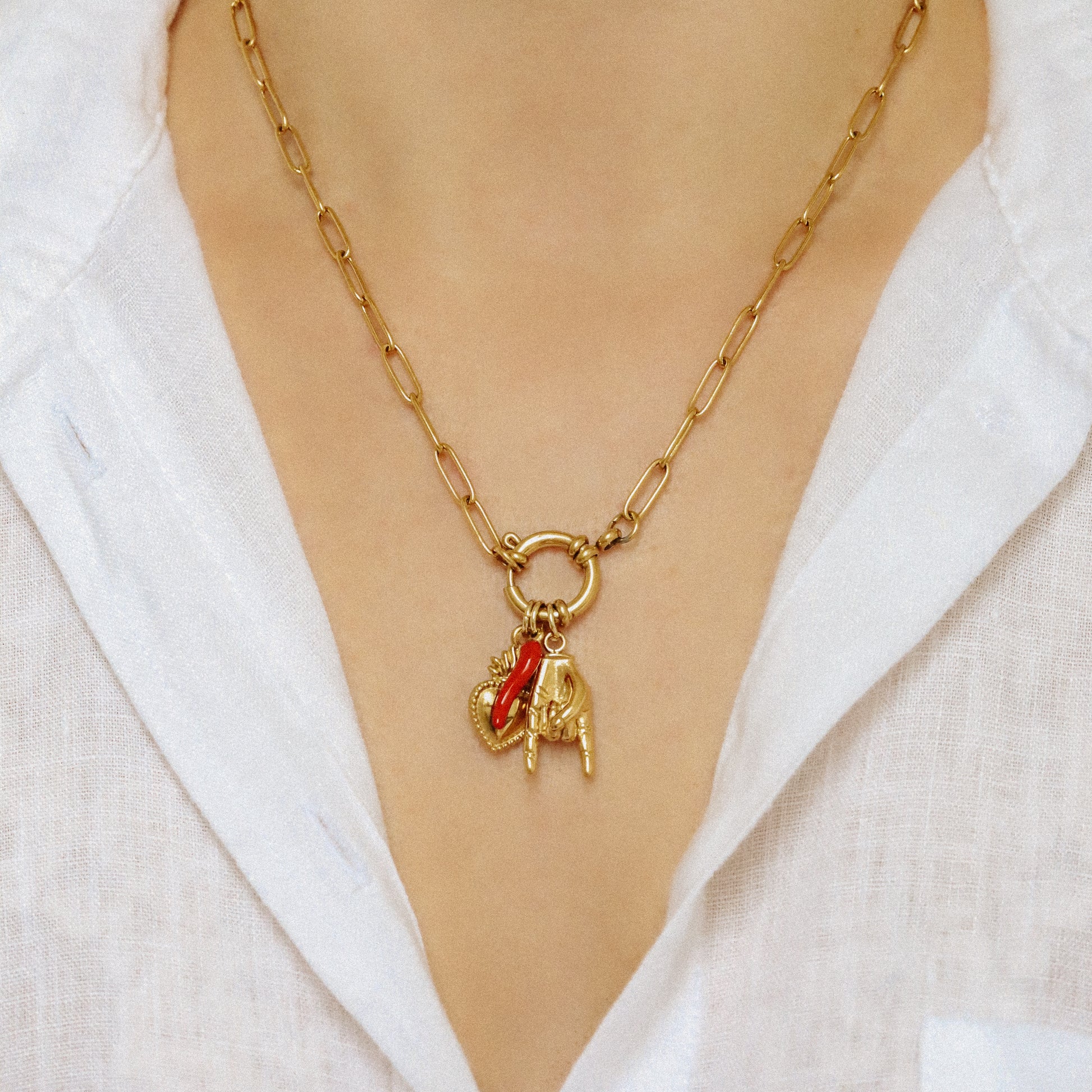 Add a unique touch to your necklace with our durable stainless steel Hand Gesture Charm. The charm features a detailed hand gesture design, adding personality and style to your accessory collection. Made to last and stand out, this charm is the perfect addition to any necklace.