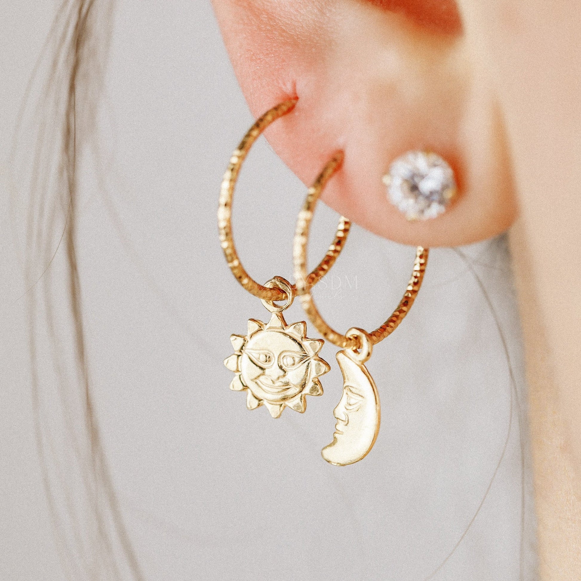 Diamond cut helix hoop earrings with sun charm.