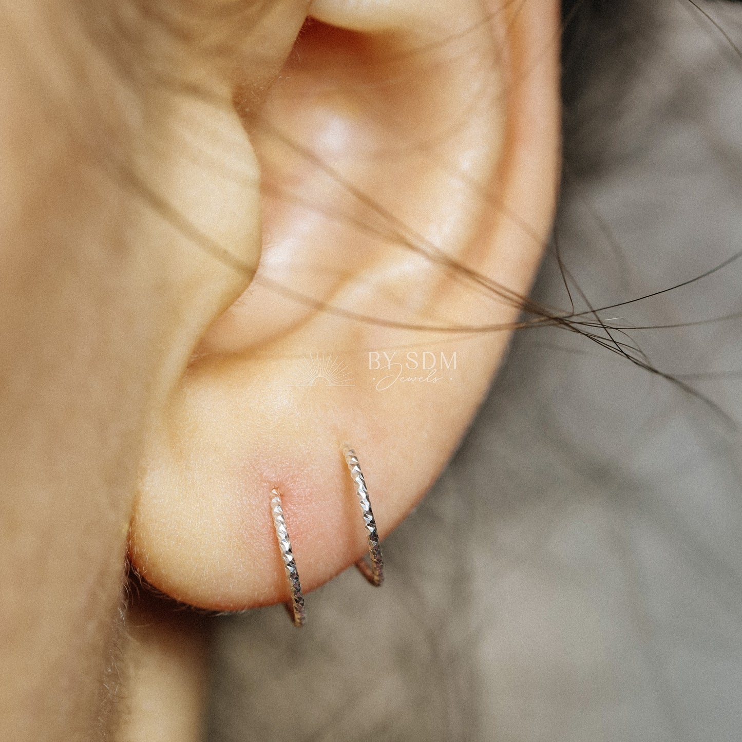 All you do is thread one side through your first hoop until the other side sits comfortably on your earlobe giving the illusion of a second hole. These are slightly adjustable as you will need to bend and mold the wires a bit to fit comfortable to your earlobe. Since everyones ear is different, they might look slightly different than photo depending on how high or low your piercing is.